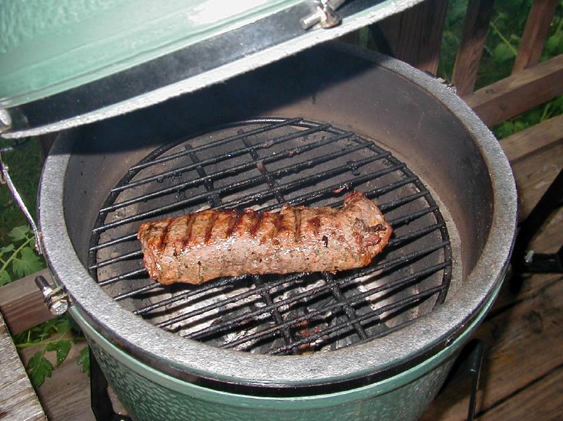Beef Tenderloin #3 Here is a really easy way to do a small 1-2 lb beef tenderloin. This one is pictured on my Small BGE. Dome temp was 500-550 deg and I seared it for 9 min per side - then seal up the Egg and let it cook until you get to the internal temp you want. This one was pulled at 145 deg. Total cook time was 21 min. |