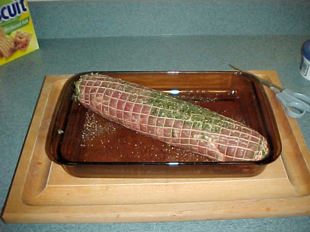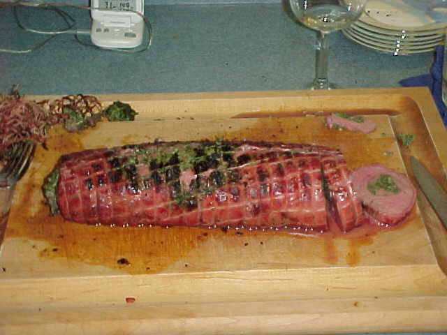 I rolled the tenderloin approx 3 times. The internal temp was 145 and as you can see - quite quite juicy. It was marvelously tender. Timing is the trick. It didn't take as long as I predicted and it was really hard to get the Egg dome temp down after being at 600 deg. I pulled the meat off after searing for 15 min to let the Egg temp drop to 350 then tossed it back on for 30 min. |